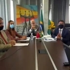 O vice-governador do Distrito Federal, Paco Britto, (centro) e o secretário de Saúde, Osnei Okumoto (direita) durante a cerimônia. Foto: reprodução.