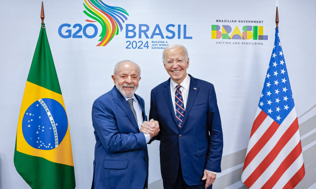 O presidente Joe Biden, reuniu-se hoje com o presidente Luiz Inácio Lula da Silva à margem da Cúpula do G20 no Rio de Janeiro, para discutir a relação estratégica Brasil-EUA, enraizada em nosso forte apoio à democracia. O presidente Biden parabenizou o presidente Lula pelo ano anfitrião do G20 no Brasil e reafirmou o apoio dos EUA aos esforços do presidente Lula para combater a fome e a pobreza e seu compromisso compartilhado de garantir que ninguém seja deixado para trás. Como parte de seu esforço conjunto para promover o trabalho decente, os líderes revisaram o progresso da Parceria pelos Direitos dos Trabalhadores, incluindo capacitar os trabalhadores a participar de discussões sobre políticas climáticas e ajudar a garantir uma transição energética justa. O presidente Biden reiterou o compromisso dos EUA com a inclusão digital, anunciando o financiamento do desenvolvimento do país para apoiar a expansão da rede de fibra óptica do Brasil, expandindo o atendimento a mais 1 milhão de residências e 4 mil escolas até 2027.