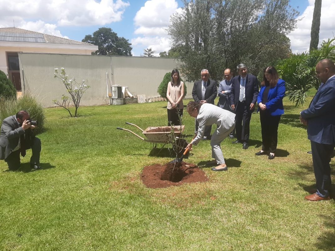 Após a coletiva de imprensa, a Dra. Aghabekian Shahin, acompanhada do embaixador palestino Ibrahim Alzeben e de diversos embaixadores árabes, plantou uma muda de oliveira, como símbolo da paz, na sede da representação diplomática da Palestina.