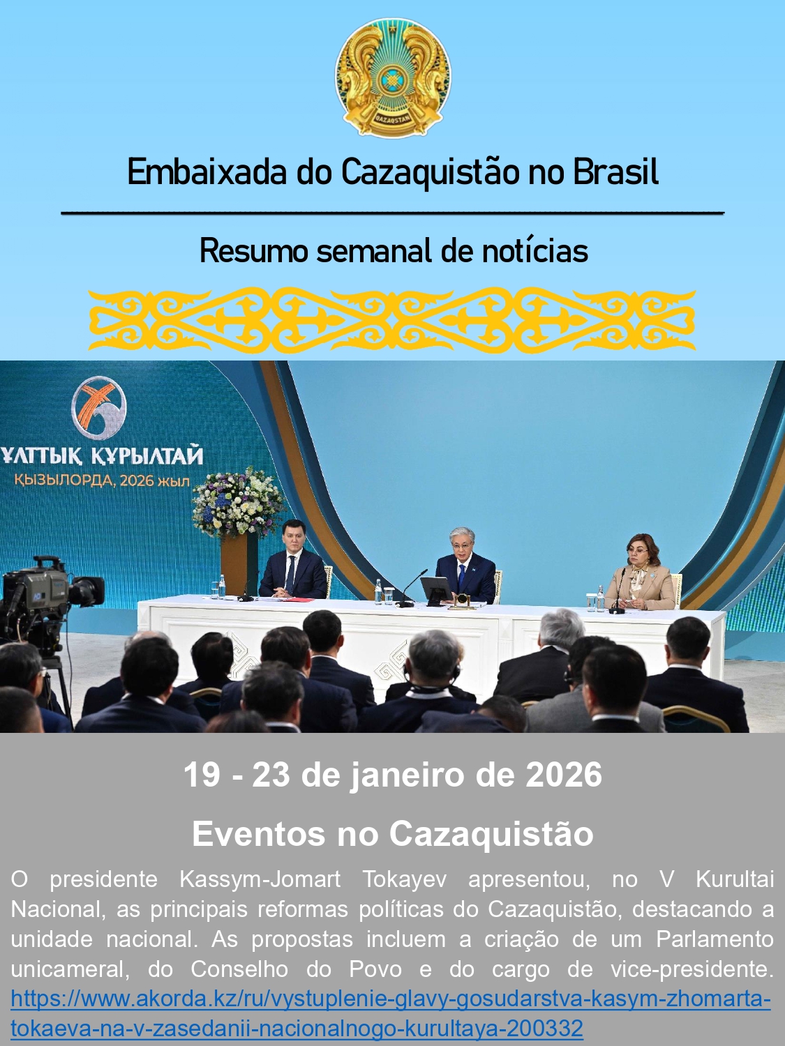 19 a 23 de janeiro | Eventos no Cazaquistão 26 de janeiro de 2026 Compartilhado FacebookTwitterPinterestWhatsApp Compartilhado FacebookTwitterPinterestWhatsApp