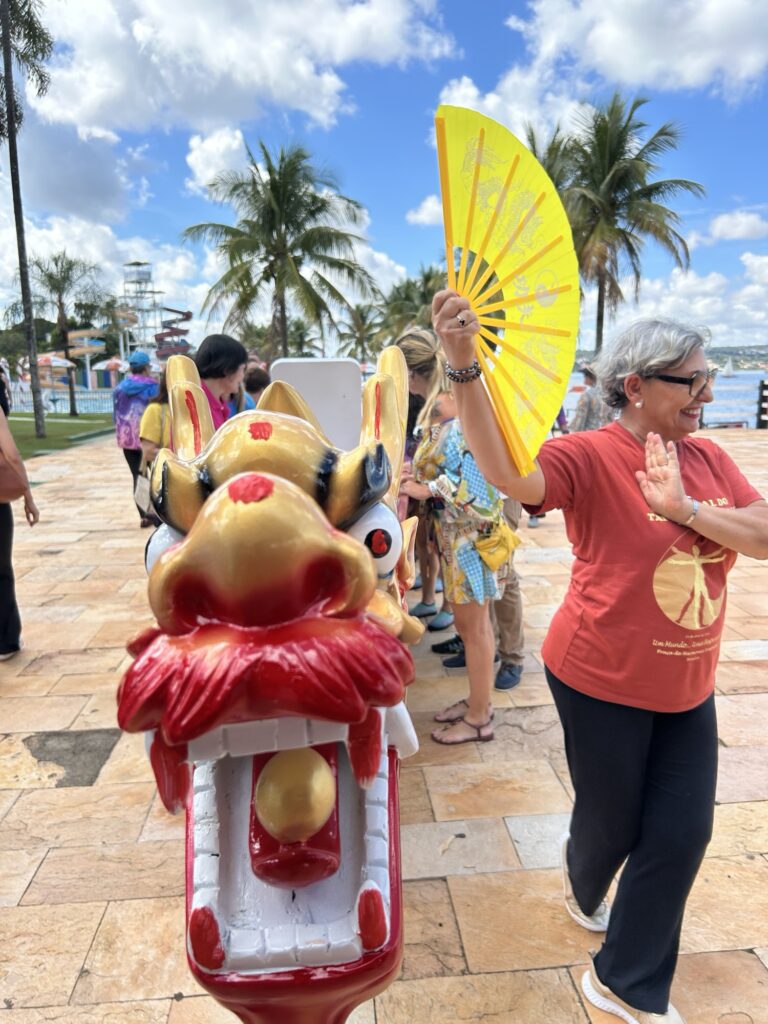 A viagem do Barco Dragão começou com a embaixatriz da China. Que deu vida ao barco junto a mulheres muito poderosas. No ritual, que incluiu elementos muito especiais, como fogo, leque e frutas, o olho do dragão recebe vida, cercada de todas as proteções. Pinturas ancestrais no rosto do dragão completaram a vela cerimônia que encantou a todos os convidados presentes, inclusive a mim.