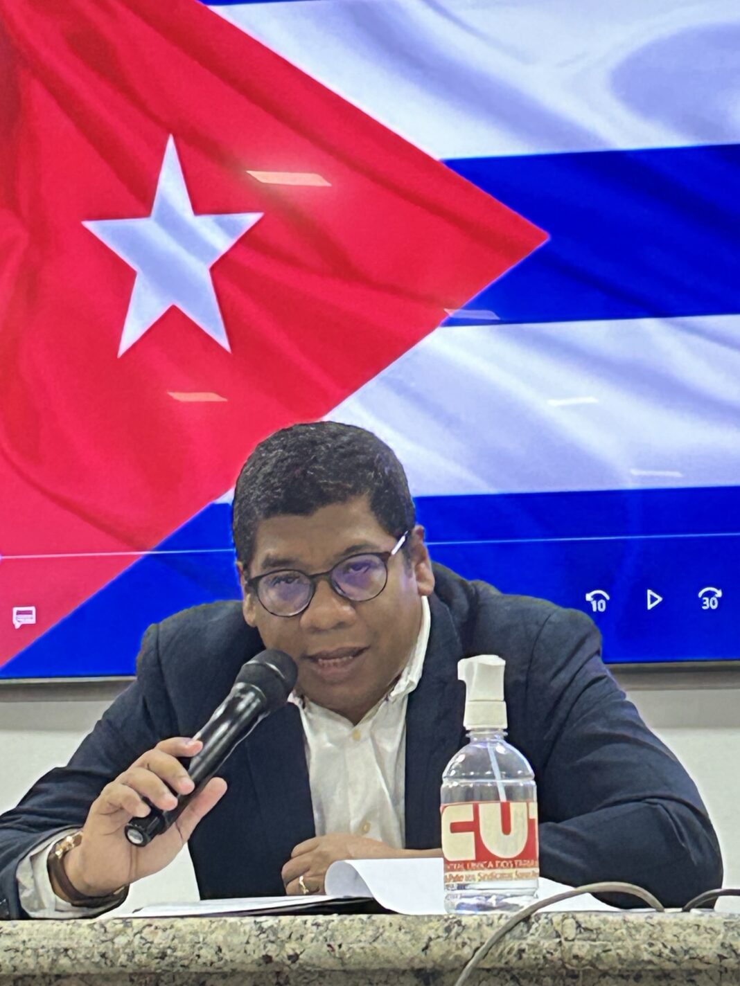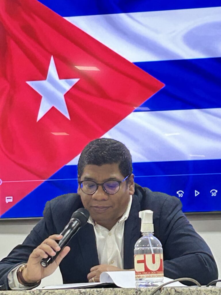 O embaixador cubano, Victor Manuel Cairo Palomo, ressaltou ser uma injustiça o bloqueio a Cuba. Movimentos sociais presentes fizeram homenagens à Ilha. Fotos: Claudia Godoy.